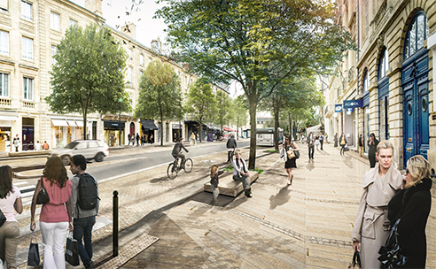 Sur les premiers rendus, ce qui est séduisant sont les matériaux couleur pierre bordelaise qui créent une harmonie et permettent de visualiser les cheminements piétons via le jardin central dont la traversée sera facilitée. Une sorte de banc qui contournera le jardin agrandi permettra de se reposer et les terrasses des cafés et commerces seront valorisées. A noter aussi que l’ex-Virgin va devenir un hôtel avec des lofts et des cafés et boutiques en son rez-de-chaussée, ce qui va animer la place.